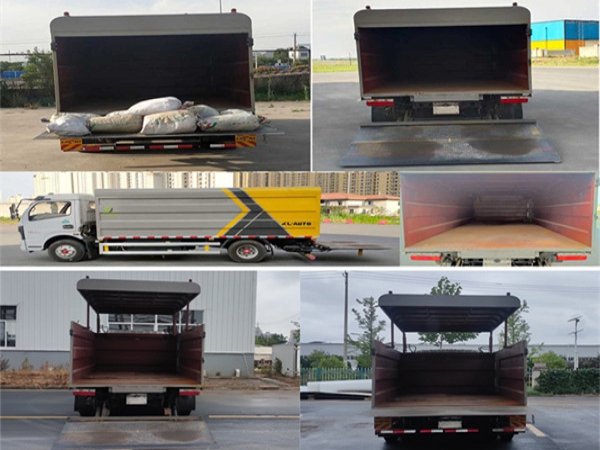 其它 | 1.該車裝備有垃圾箱體,液壓升降頂蓋,液壓尾板等專用裝置,用于實現垃圾桶的裝卸及運輸功能,頂蓋可向上開啟;2.尾板質量為:450kg,尾板收起的水平狀態為:200mm;3.側面防護裝置材料為鋁合金,連接方式為螺栓連接,后下部防護裝置為圓形管材料為Q235B,連接方式:螺栓連接,后部防護裝置截面尺寸為直徑110mm,離地高度:440mm;4.儲能裝置類型/生產廠家:磷酸鐵鋰電池/寧德時代新能源科技股份有限公司;電機額定功率/峰值功率:60kW/110kW;5.ABS型號/生產廠商為:ABS/ASR-12V-4S/4M/襄陽東風隆誠機械有限公司.6.該車型可選裝車載ETC裝置;7.該車型選裝不同尺寸的垃圾箱體,標準型時整車長:6650mm,整車寬為:2100mm/2140mm,整車高:2520mm,后懸:1672mm加長型箱體時整車長:6750mm/6850mm,整車寬為:2140mm/2200mm,整車高:2615mm/2710mm,后懸:1772mm/1872mm,標準型與加長型箱體整備質量在誤差范圍內,忽略不計;8.該車型可選裝輕量化箱體,整備質量/額定載質量:5200kg/3100kg,隨底盤選裝駕駛室外觀.選裝后部外觀結構 | ||