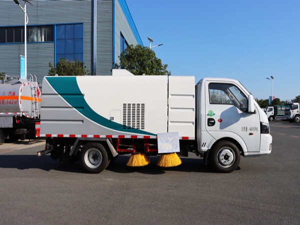 該掃路車采用純電動二類底盤改裝、風機、清水箱、垃圾箱、左右立掃、掃盤降塵系統、左右側噴高、氣動系統、液壓系統、專用裝置電控系統和副車架等改裝而成。