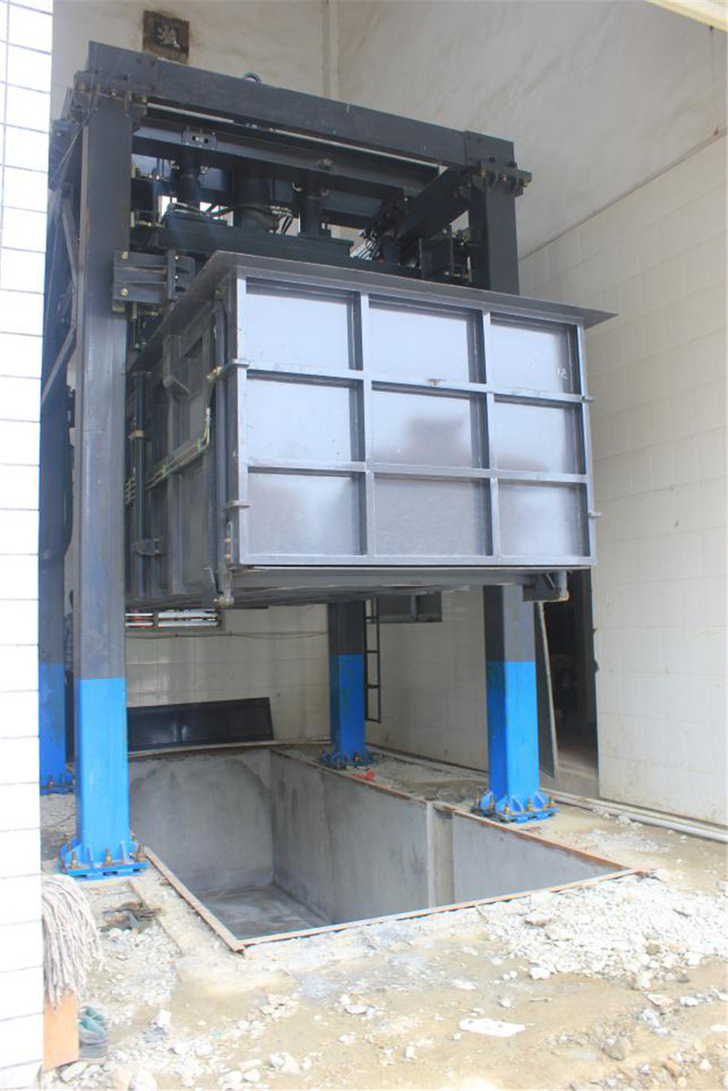 垃圾箱體是垂直式垃圾壓縮站的主體。它將各個系統(tǒng)和機構有機的連接起來,完成垃圾的收集、壓縮。垃圾箱體的頂部設有投料口,主要用于垃圾的收集;垃圾箱體插銷孔座,通過壓頭的四個液壓插銷將壓頭與垃圾箱體連接在一起,并通過壓縮油缸實現(xiàn)上升和下降;垃圾箱兩側各設置有4組導向滑塊,確保垃圾箱上升和下降平穩(wěn);同時垃圾箱體中段與推鏟機構、閘門機構共同組成了一個密閉的空腔,以實現(xiàn)垃圾的垂直壓縮;壓縮完的垃圾塊儲存在垃圾箱體的出料口端,一次可儲存2塊垃圾塊。